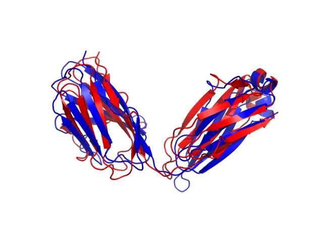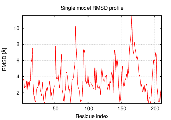 Above is the comparison between the input structure and the most aggregation prone model (predicted in the flexibility simulations, download both models in the PDB file format , download table with rmsd values ). The picture presents the most aggregation prone model (in blue) superimposed on the input structure (in red). The plot shows rmsd profile (distances between residues of the superimposed structures).