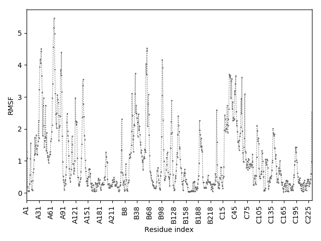 (the most aggregation prone model in blue, input in red) and RMSF plot which shows the extent of residue fluctuations in Angstroms (predicted by CABS-flex).