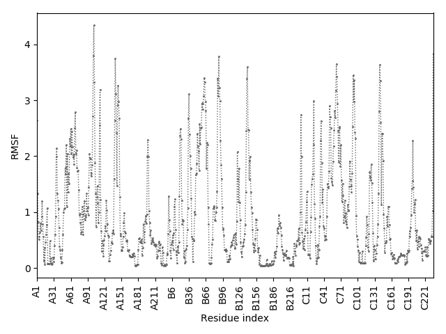 (the most aggregation prone model in blue, input in red) and RMSF plot which shows the extent of residue fluctuations in Angstroms (predicted by CABS-flex).