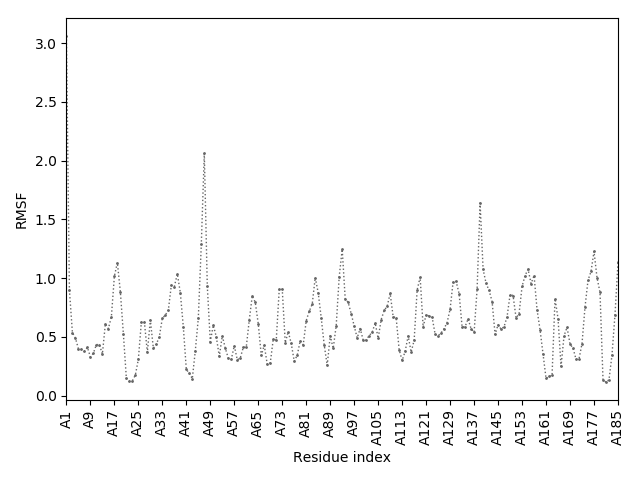 (the most aggregation prone model in blue, input in red) and RMSF plot which shows the extent of residue fluctuations in Angstroms (predicted by CABS-flex).