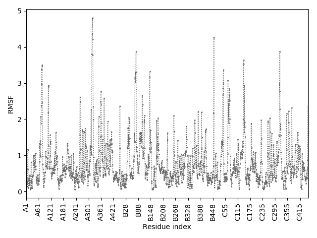 (the most aggregation prone model in blue, input in red) and RMSF plot which shows the extent of residue fluctuations in Angstroms (predicted by CABS-flex).