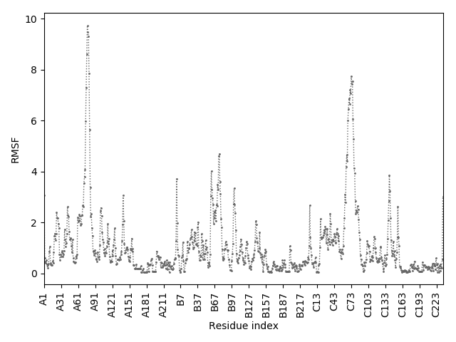(the most aggregation prone model in blue, input in red) and RMSF plot which shows the extent of residue fluctuations in Angstroms (predicted by CABS-flex).
