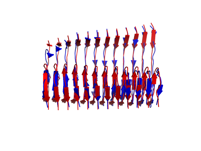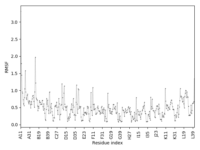 (the most aggregation prone model in blue, input in red) and RMSF plot which shows the extent of residue fluctuations in Angstroms (predicted by CABS-flex).