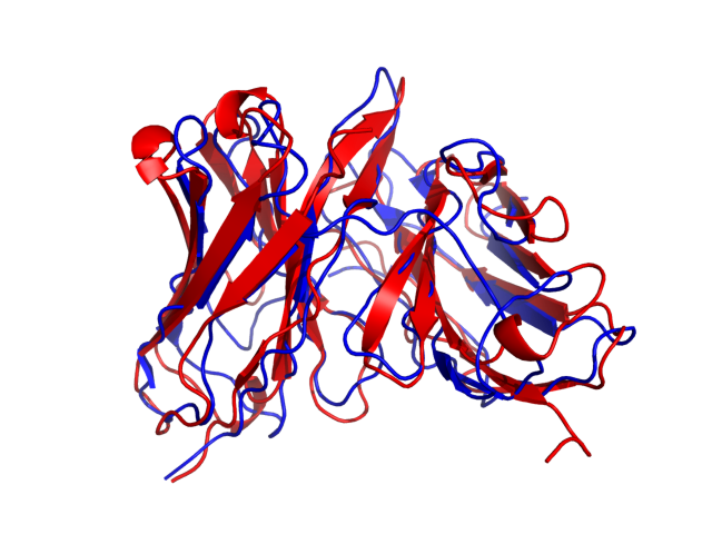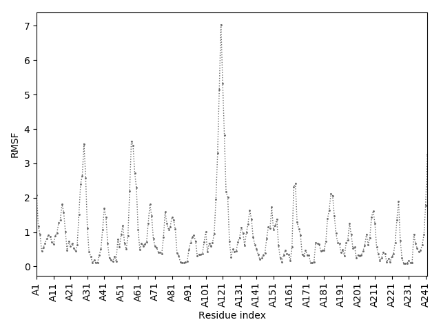 (the most aggregation prone model in blue, input in red) and RMSF plot which shows the extent of residue fluctuations in Angstroms (predicted by CABS-flex).