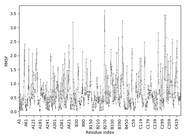 (the most aggregation prone model in blue, input in red) and RMSF plot which shows the extent of residue fluctuations in Angstroms (predicted by CABS-flex).