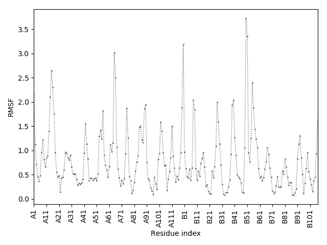 (the most aggregation prone model in blue, input in red) and RMSF plot which shows the extent of residue fluctuations in Angstroms (predicted by CABS-flex).