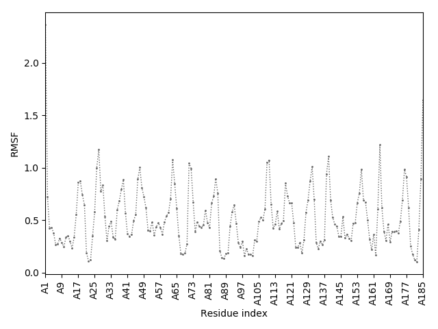 (the most aggregation prone model in blue, input in red) and RMSF plot which shows the extent of residue fluctuations in Angstroms (predicted by CABS-flex).