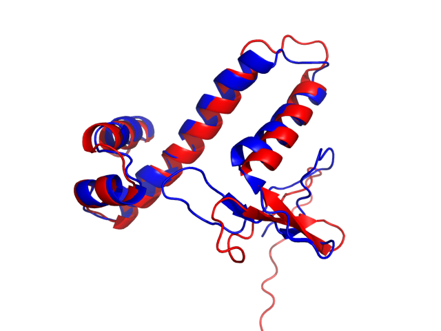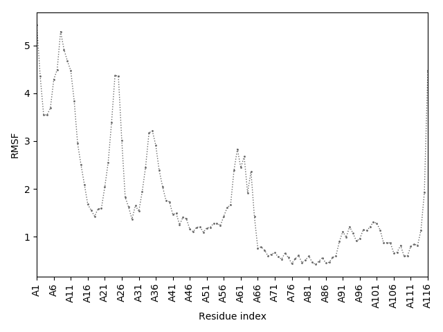 (the most aggregation prone model in blue, input in red) and RMSF plot which shows the extent of residue fluctuations in Angstroms (predicted by CABS-flex).