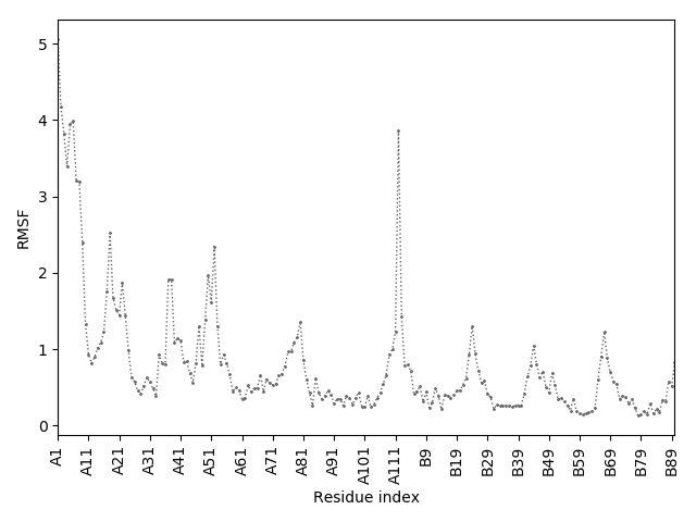 (the most aggregation prone model in blue, input in red) and RMSF plot which shows the extent of residue fluctuations in Angstroms (predicted by CABS-flex).