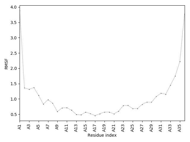 (the most aggregation prone model in blue, input in red) and RMSF plot which shows the extent of residue fluctuations in Angstroms (predicted by CABS-flex).
