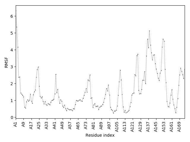 (the most aggregation prone model in blue, input in red) and RMSF plot which shows the extent of residue fluctuations in Angstroms (predicted by CABS-flex).