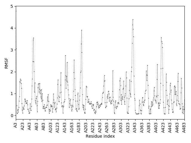 (the most aggregation prone model in blue, input in red) and RMSF plot which shows the extent of residue fluctuations in Angstroms (predicted by CABS-flex).
