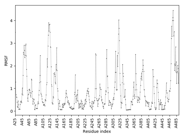 (the most aggregation prone model in blue, input in red) and RMSF plot which shows the extent of residue fluctuations in Angstroms (predicted by CABS-flex).