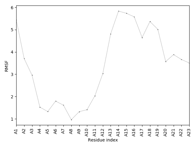 (the most aggregation prone model in blue, input in red) and RMSF plot which shows the extent of residue fluctuations in Angstroms (predicted by CABS-flex).