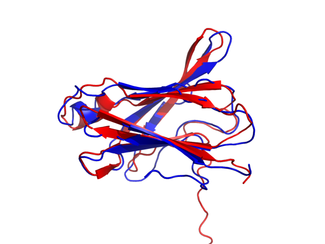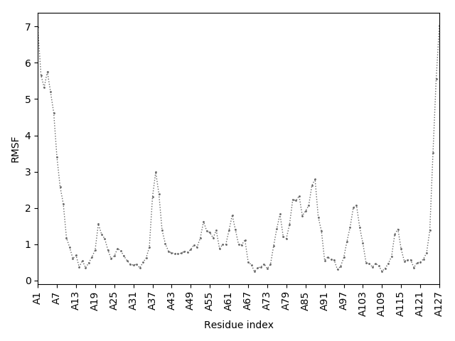 (the most aggregation prone model in blue, input in red) and RMSF plot which shows the extent of residue fluctuations in Angstroms (predicted by CABS-flex).