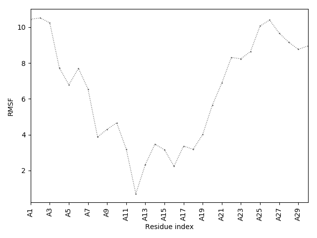 (the most aggregation prone model in blue, input in red) and RMSF plot which shows the extent of residue fluctuations in Angstroms (predicted by CABS-flex).