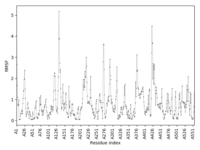 (the most aggregation prone model in blue, input in red) and RMSF plot which shows the extent of residue fluctuations in Angstroms (predicted by CABS-flex).