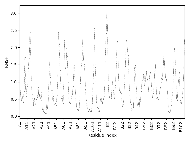 (the most aggregation prone model in blue, input in red) and RMSF plot which shows the extent of residue fluctuations in Angstroms (predicted by CABS-flex).