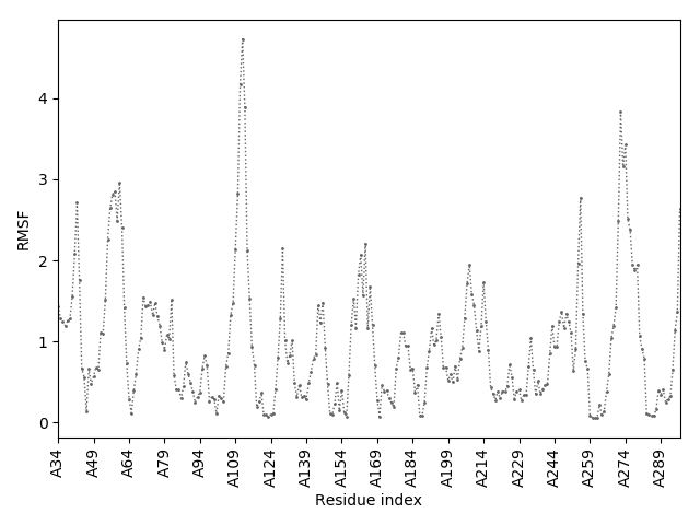 (the most aggregation prone model in blue, input in red) and RMSF plot which shows the extent of residue fluctuations in Angstroms (predicted by CABS-flex).