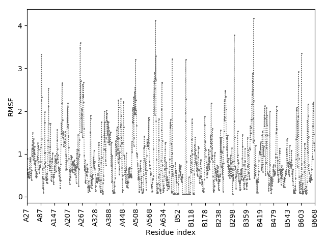 (the most aggregation prone model in blue, input in red) and RMSF plot which shows the extent of residue fluctuations in Angstroms (predicted by CABS-flex).