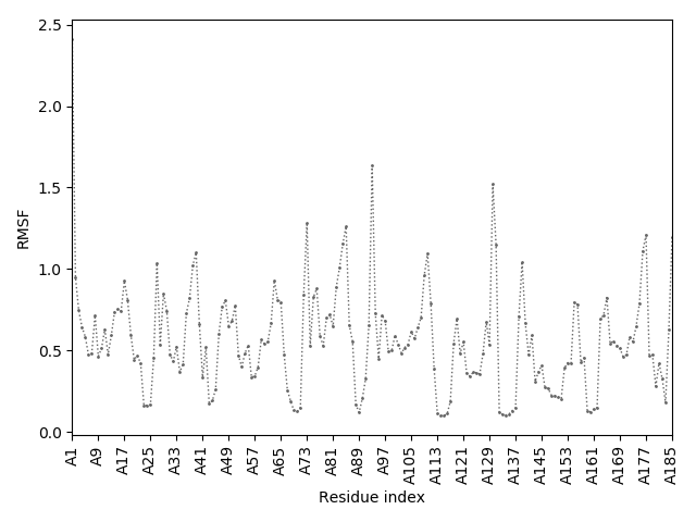 (the most aggregation prone model in blue, input in red) and RMSF plot which shows the extent of residue fluctuations in Angstroms (predicted by CABS-flex).