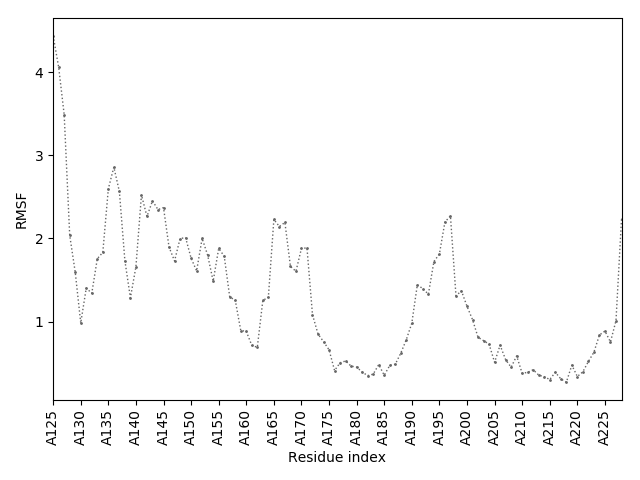 (the most aggregation prone model in blue, input in red) and RMSF plot which shows the extent of residue fluctuations in Angstroms (predicted by CABS-flex).