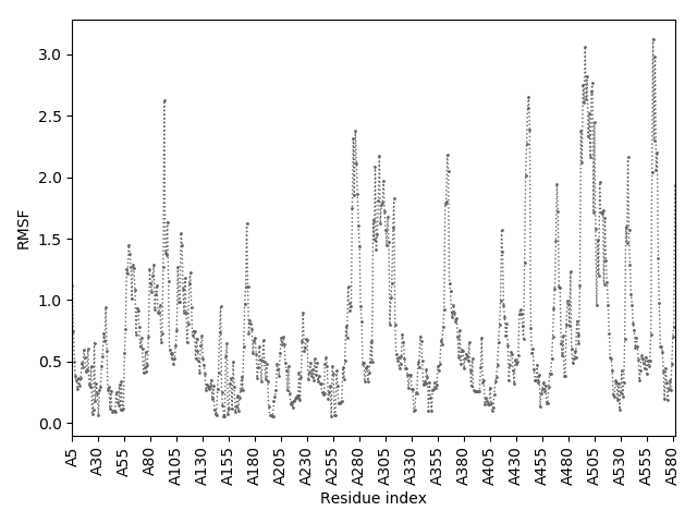 (the most aggregation prone model in blue, input in red) and RMSF plot which shows the extent of residue fluctuations in Angstroms (predicted by CABS-flex).