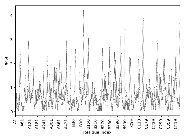 (the most aggregation prone model in blue, input in red) and RMSF plot which shows the extent of residue fluctuations in Angstroms (predicted by CABS-flex).