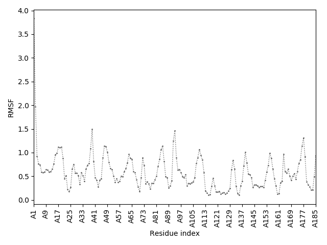(the most aggregation prone model in blue, input in red) and RMSF plot which shows the extent of residue fluctuations in Angstroms (predicted by CABS-flex).