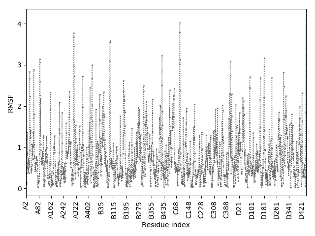 (the most aggregation prone model in blue, input in red) and RMSF plot which shows the extent of residue fluctuations in Angstroms (predicted by CABS-flex).