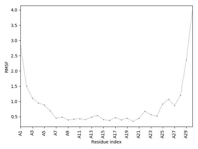 (the most aggregation prone model in blue, input in red) and RMSF plot which shows the extent of residue fluctuations in Angstroms (predicted by CABS-flex).
