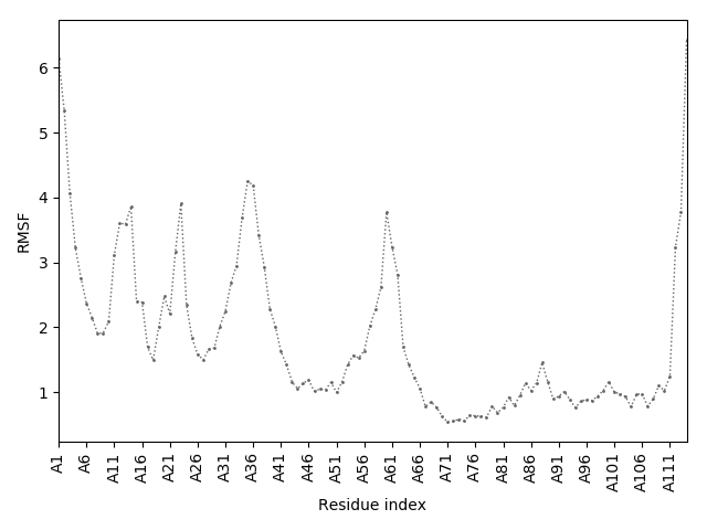 (the most aggregation prone model in blue, input in red) and RMSF plot which shows the extent of residue fluctuations in Angstroms (predicted by CABS-flex).