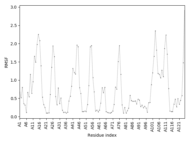 (the most aggregation prone model in blue, input in red) and RMSF plot which shows the extent of residue fluctuations in Angstroms (predicted by CABS-flex).