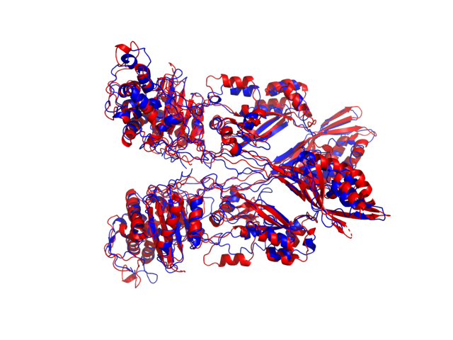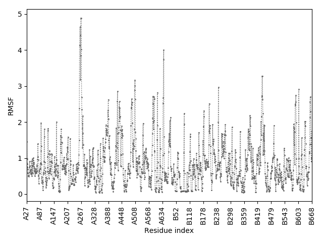 (the most aggregation prone model in blue, input in red) and RMSF plot which shows the extent of residue fluctuations in Angstroms (predicted by CABS-flex).