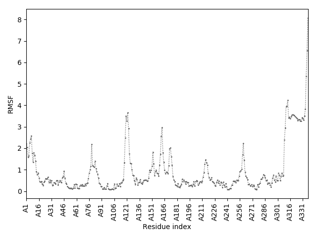 (the most aggregation prone model in blue, input in red) and RMSF plot which shows the extent of residue fluctuations in Angstroms (predicted by CABS-flex).