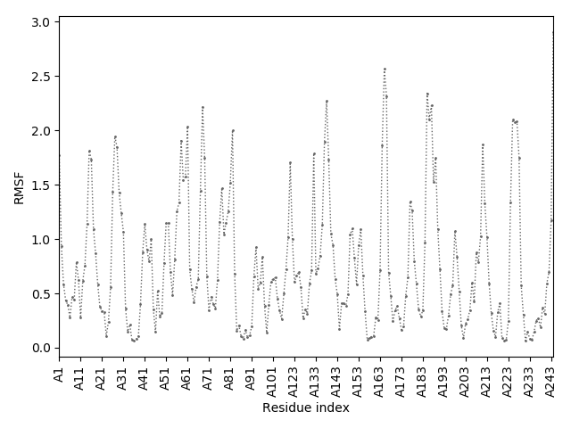 (the most aggregation prone model in blue, input in red) and RMSF plot which shows the extent of residue fluctuations in Angstroms (predicted by CABS-flex).