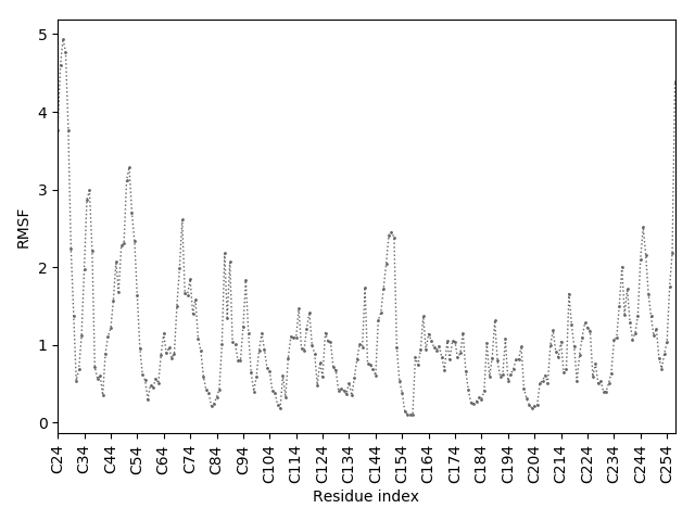 (the most aggregation prone model in blue, input in red) and RMSF plot which shows the extent of residue fluctuations in Angstroms (predicted by CABS-flex).