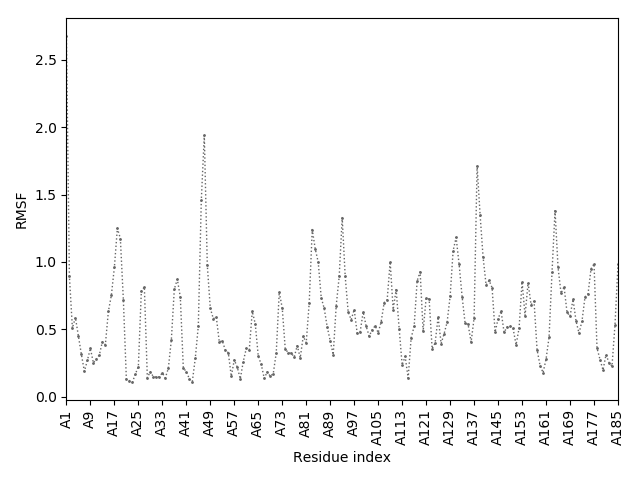 (the most aggregation prone model in blue, input in red) and RMSF plot which shows the extent of residue fluctuations in Angstroms (predicted by CABS-flex).