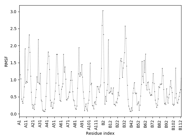 (the most aggregation prone model in blue, input in red) and RMSF plot which shows the extent of residue fluctuations in Angstroms (predicted by CABS-flex).
