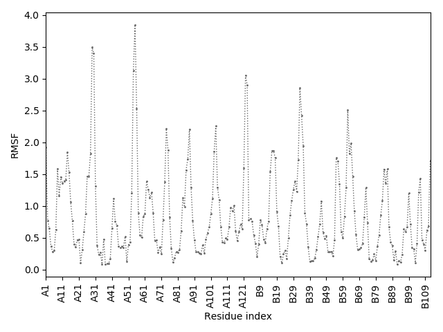 (the most aggregation prone model in blue, input in red) and RMSF plot which shows the extent of residue fluctuations in Angstroms (predicted by CABS-flex).