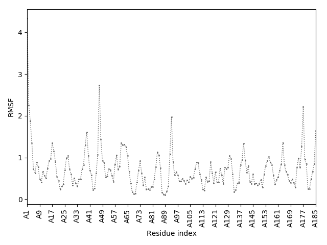 (the most aggregation prone model in blue, input in red) and RMSF plot which shows the extent of residue fluctuations in Angstroms (predicted by CABS-flex).