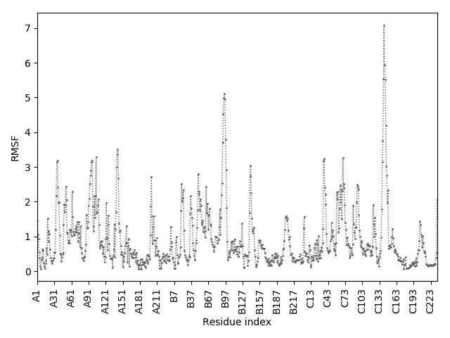 (the most aggregation prone model in blue, input in red) and RMSF plot which shows the extent of residue fluctuations in Angstroms (predicted by CABS-flex).