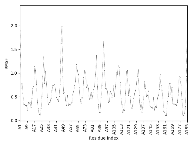 (the most aggregation prone model in blue, input in red) and RMSF plot which shows the extent of residue fluctuations in Angstroms (predicted by CABS-flex).