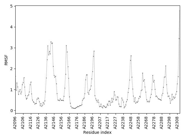 (the most aggregation prone model in blue, input in red) and RMSF plot which shows the extent of residue fluctuations in Angstroms (predicted by CABS-flex).