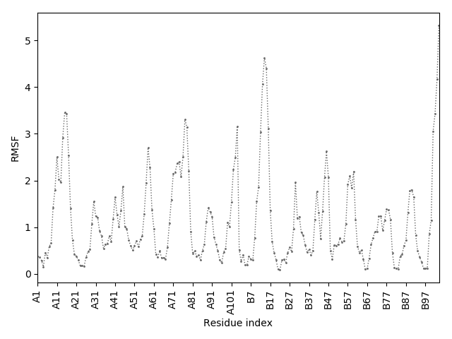 (the most aggregation prone model in blue, input in red) and RMSF plot which shows the extent of residue fluctuations in Angstroms (predicted by CABS-flex).