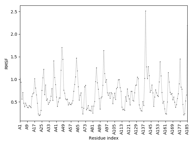 (the most aggregation prone model in blue, input in red) and RMSF plot which shows the extent of residue fluctuations in Angstroms (predicted by CABS-flex).