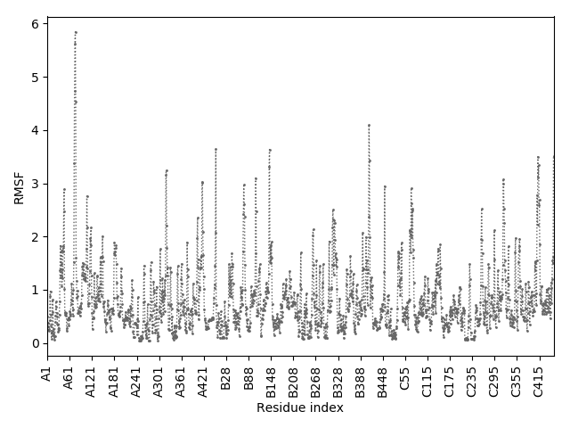 (the most aggregation prone model in blue, input in red) and RMSF plot which shows the extent of residue fluctuations in Angstroms (predicted by CABS-flex).