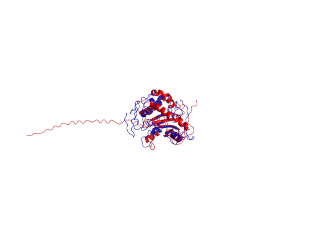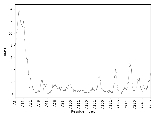 (the most aggregation prone model in blue, input in red) and RMSF plot which shows the extent of residue fluctuations in Angstroms (predicted by CABS-flex).