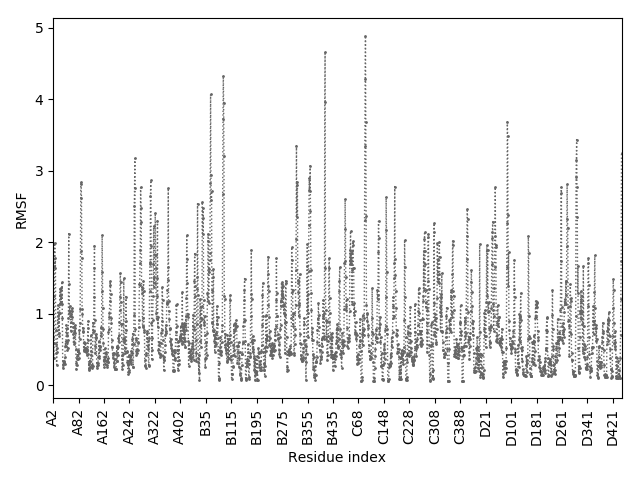(the most aggregation prone model in blue, input in red) and RMSF plot which shows the extent of residue fluctuations in Angstroms (predicted by CABS-flex).