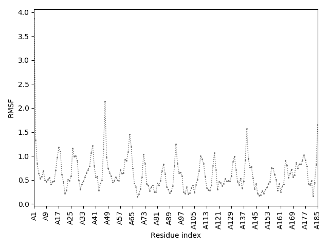 (the most aggregation prone model in blue, input in red) and RMSF plot which shows the extent of residue fluctuations in Angstroms (predicted by CABS-flex).